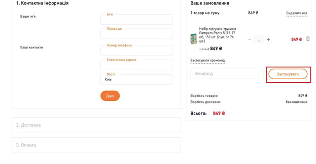 - Після натискання кнопки застосування сума вашого чека автоматично зменшиться, враховуючи активну знижку на дитячі іграшки, декоративну косметику чи навіть все для хобі та відпочинку.