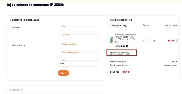 Щоб застосувати промокод MauDau, необхідно вибрати товар, додати його в «кошик» і перейти в меню оформлення замовлення. Відразу буде видно, куди вводити промокод – праворуч біля вартості товару.